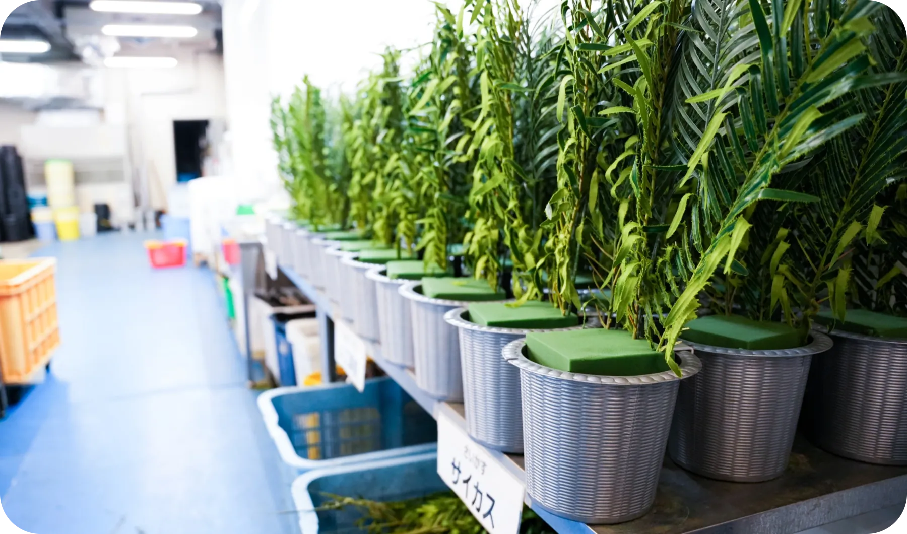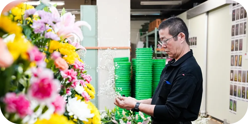 生花専門の装飾チームは20代から50代まで、技術者30名が在籍しています。大型の葬儀、ホテルや飲食店のイベントなど、大小年間数千件の装飾を担当。50年以上の歴史を持ち、関西では名実ともにNo.1です。