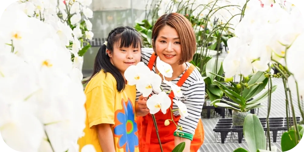 障がいを持つスタッフと自社農園で大切に育てた胡蝶蘭をお届けします。一般流通の「市場」や「仲卸」といった中間コストを省いたことで、年間を通して適正価格で胡蝶蘭をご提供いたします。