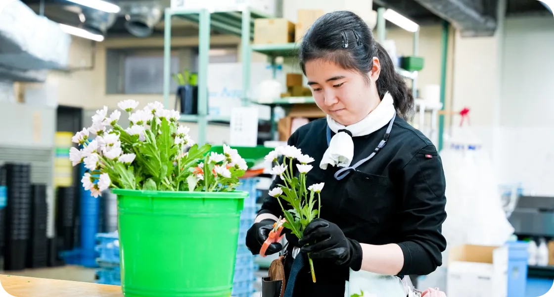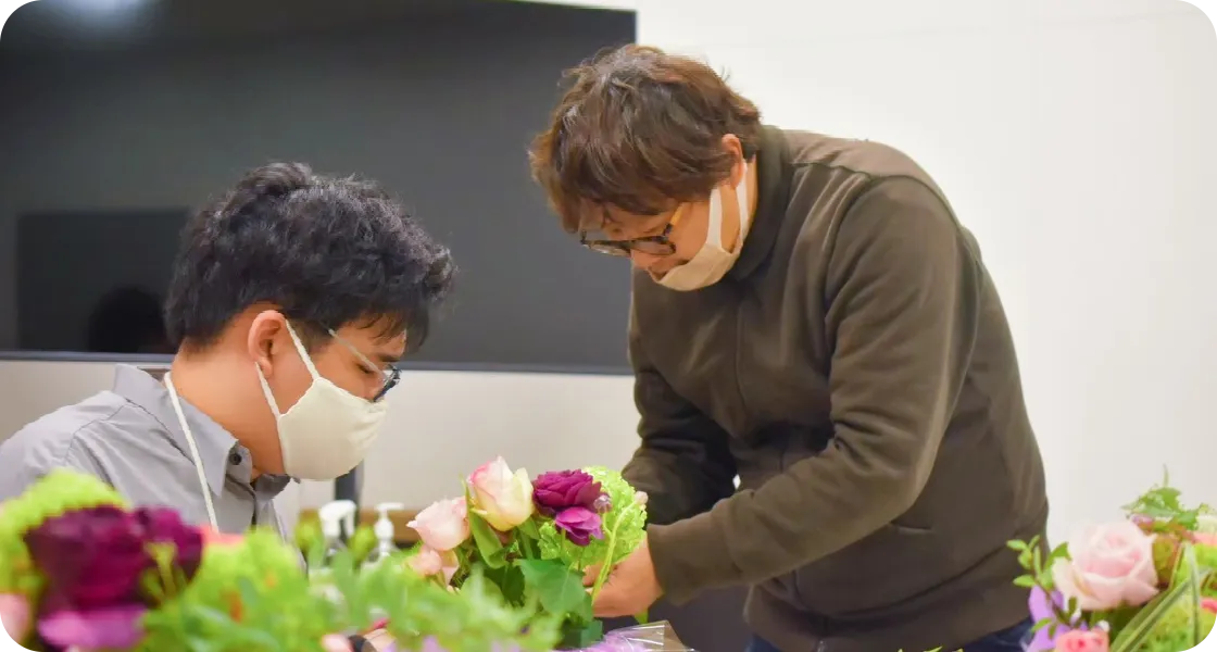 今や、彼らはチームには欠かせない存在となり、スローペースながらも丁寧で、何よりも”お花の仕事が好き!”という情熱がチーム全体に活力を与えています。彼らの仕事に対する姿勢は、私たちの答えとなりました。一人ひとりの才能や成長の違いをマイナスにとらえるのではなく、それを尊重し、多様な人材が織りなす新たな価値を見出すことが、コミュニティ全体の成長につながるのだと教えてもらいました。