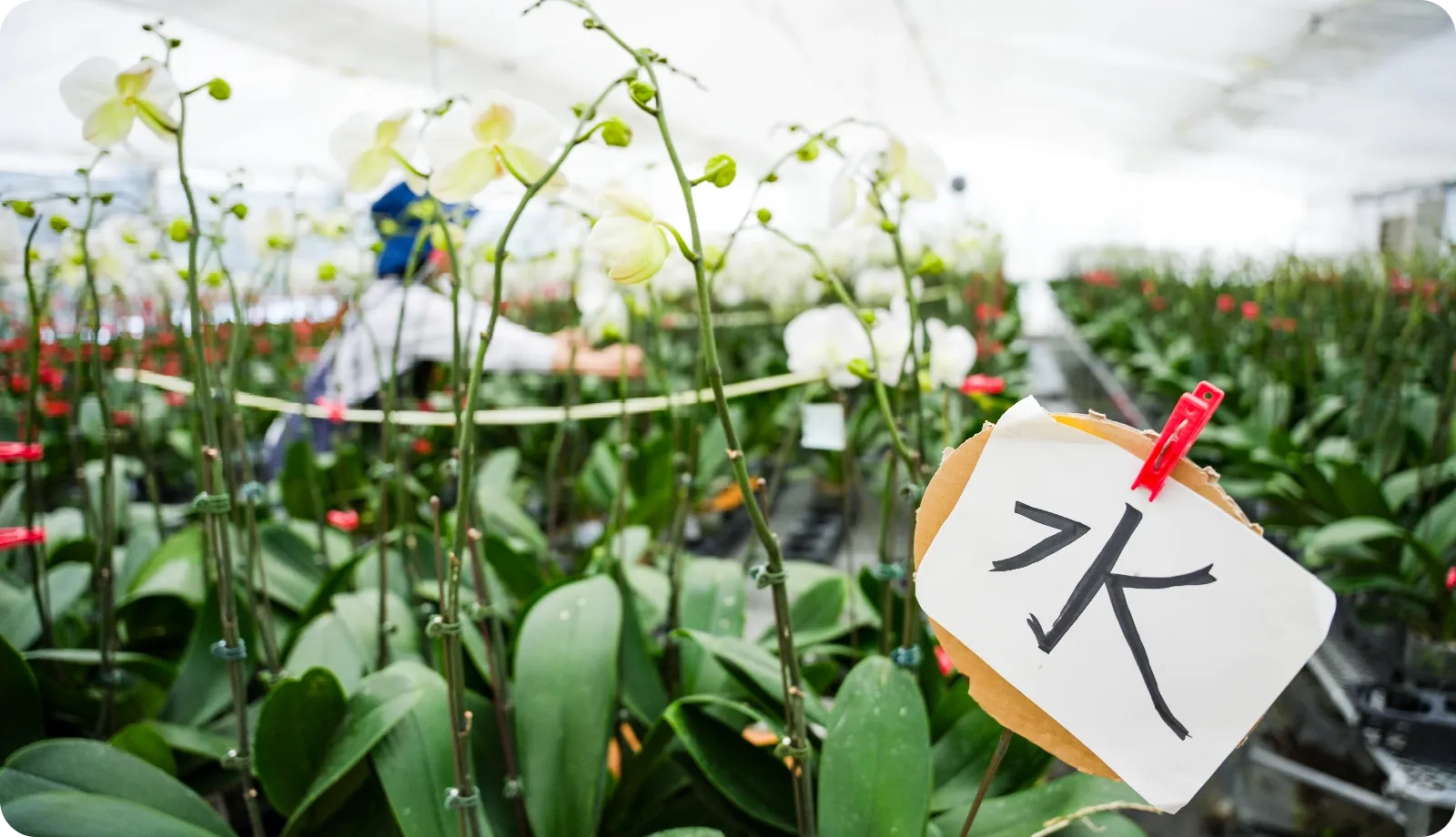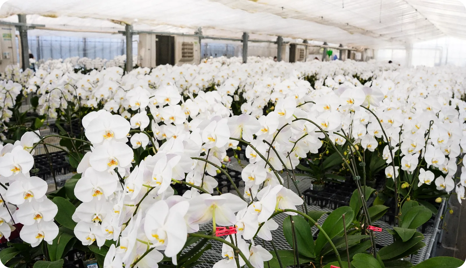 兵庫県の加古川にある比較的小規模な胡蝶蘭農園。台湾から仕入れた苗を6ヶ月かけて大輪の胡蝶蘭に育てて出荷しています。グループ内の福祉施設「いちごいちえ」と連携して、大切に育てています。
