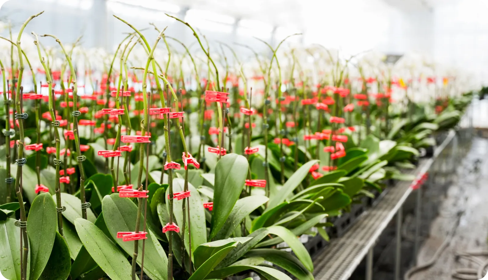 ずらりと並んだ胡蝶蘭は圧巻です。一般的な花屋では、数を揃えようとするとどうしてもサイズがバラバラになりますが、弊社では同等品でご対応します。年間契約頂ける法人さまには魅力的なお見積もご用意しております。